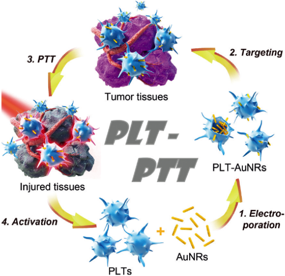 该小组创新地利用负载金纳米棒的血小板细胞靶向头颈部鳞状细胞癌组织,这种靶向效应结合金纳米棒的光热效应,可以实现头颈部肿瘤的精准治疗。实验结果表明,这种仿生纳米材料能够有效地逃脱免疫系统的消灭,抑制肿瘤的生长。该策略可促进头颈部鳞状细胞癌的治疗,具有临床转化价值。